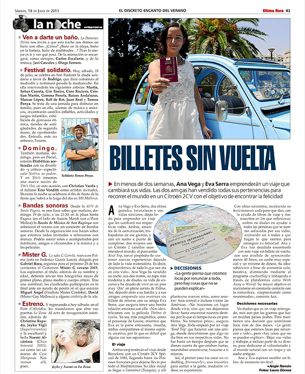 Reportaje en el diario balear Última Hora previo a la partida a la aventura. Apareció en portada y página completa de entrevista.